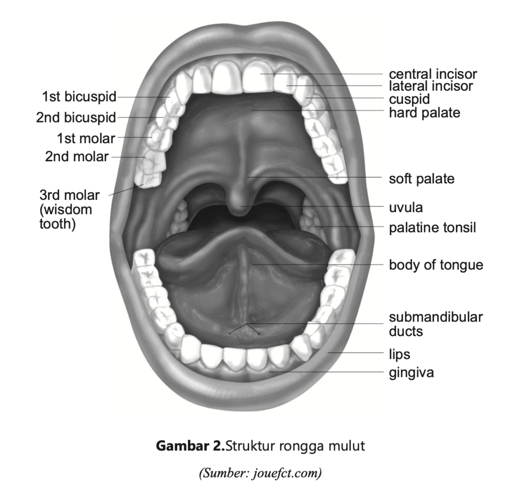 Mulut menjadi tempat pertama masuknya makanan padat dan cair serta menjadi tempat masuknya sistem pencernaan. Di dalam mulut makanan dipotong potong oleh gigi gigi depan (incisivus) dan dikunyah oleh gigi gigi belakang (molar/ geraham) menjadi bagian bagian kecil agar lebih mudah dicerna oleh air liur. Enzim Dalam air liur, disebut amilase, berfungsi memecah karbohidrat tertentu menjadi bentuk yang lebih sederhana. (Mardalena, 2018).