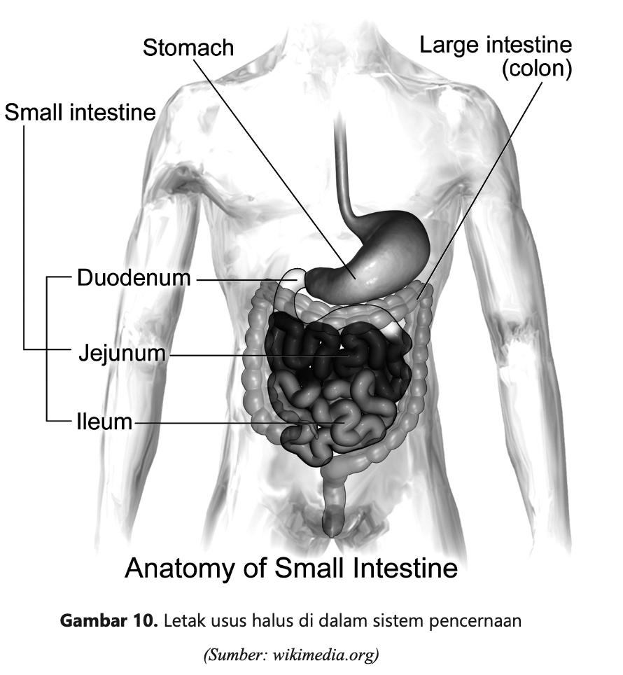 Jejunum adalah bagian kedua usus halus, terletak antara duodenum dan ileum. Pada manusia dewasa, panjang seluruh usus halus sekitar 2–8 meter, dengan jejunum sekitar 1–2 meter. Jejunum dan ileum digantung dalam rongga perut oleh mesenterium. Permukaan dalam jejunum memiliki vili usus yang memperluas area penyerapan. Secara histologis, jejunum memiliki lebih sedikit kelenjar Brunner dibandingkan duodenum, dan lebih sedikit sel goblet serta plak Peyer dibandingkan ileum.c. Ileum (Usus Penyerapan)