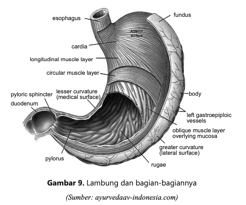 Setelah makanan masuk ke dalam perut, proses pencernaan terus berlanjut di dalam lambung. Lambung merupakan organ berongga yang terbuat dari otot berukuran besar dan terdiri dari tiga bagian, yaitu kardia, fundus, dan antrum. Makanan masuk ke dalam lambung dari kerongkongan melalui otot berbentuk cincin (sfingter), yang dapat membuka dan menutup. Dalam kondisi normal, sfingter ini mencegah isi lambung kembali naik ke kerongkongan. Sfingter yang terletak di bagian atas disebut sfingter kardia.