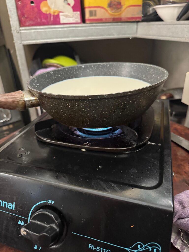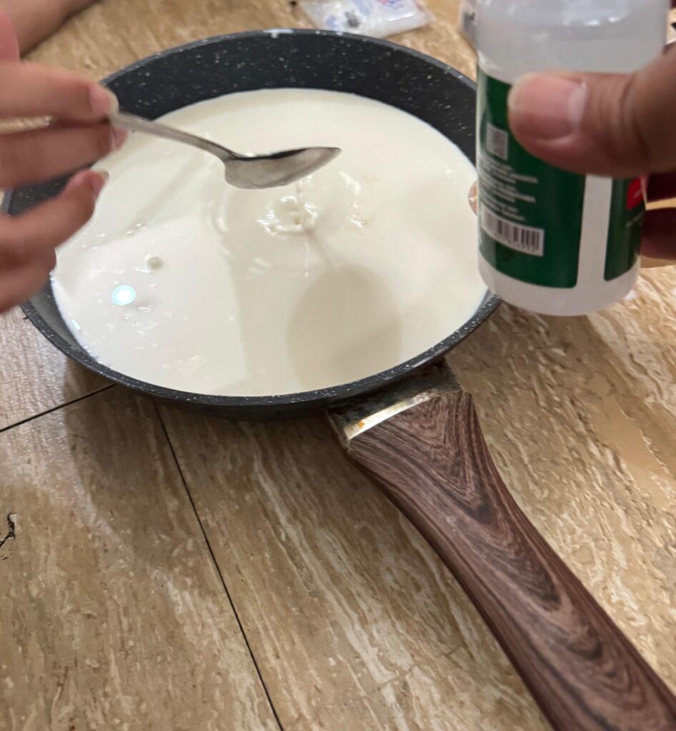 - Pertama, susu di panaskan dalam panci dengan api kecil hingga hangat setelah itu tambahkan satuan larutan cuka dan citric acid. Campuran ini akan membuat susu ngegumpal, sehingga terbentuk dadih dan whey.