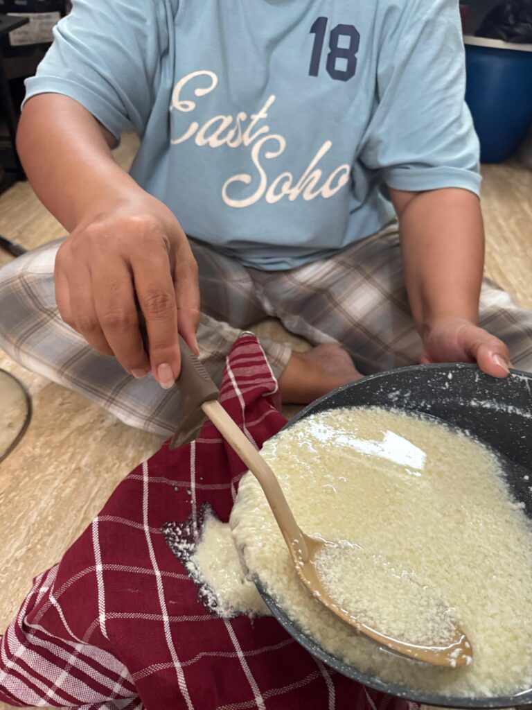 - Langkah berikutnya, dadih di beri sedikit soda kue untuk membantu mengatur keasaman. Lalu ditambahkan garam, mentega dan susu agar rasanya gurih serta teksturenya lebih lembut. Adonan kemudian dipanaskan kembali sambil di aduk sampai tercampur dengan rata.