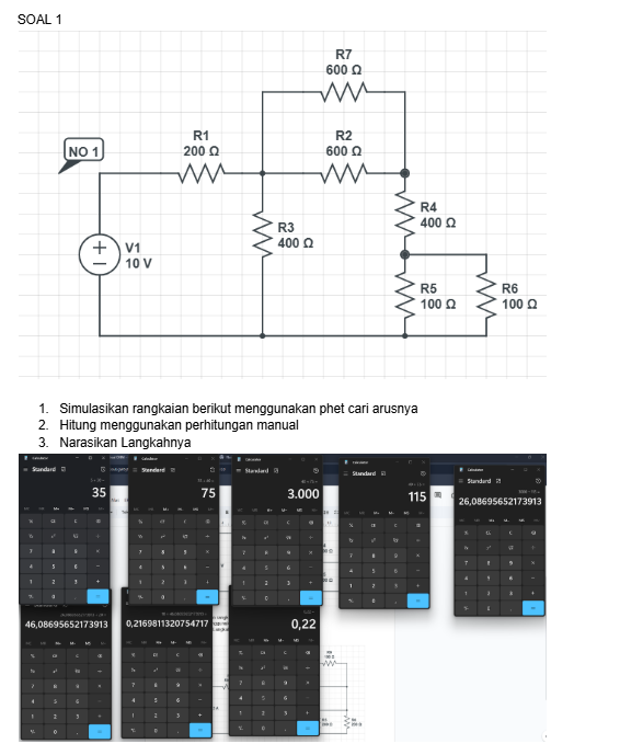 tambahkan ohm rangkaian seri (+40Ω ) = 75Ω setelah itu pararelkan dengan R3 (40×75) ÷ (40+75) = 3000 ÷ 115 = 26,08695652173913, setelah itu ditambahkan Rseri (R1) 26,08695652173913 + 20 = 46,08695652173913