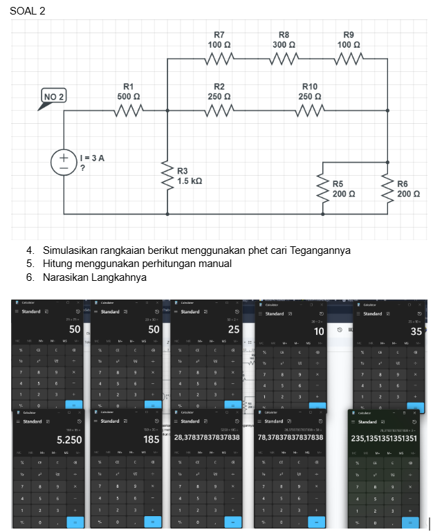 25+10 = 35, diket Rtot RP = 35Ω, lalu dipararelkan dengan R3, (150 x 35) ÷ (150+35) = 5250 ÷ 185 = 28,37837837837838 lalu tambah Rangkaian seri yaitu 50Ω = 78,37837837837838