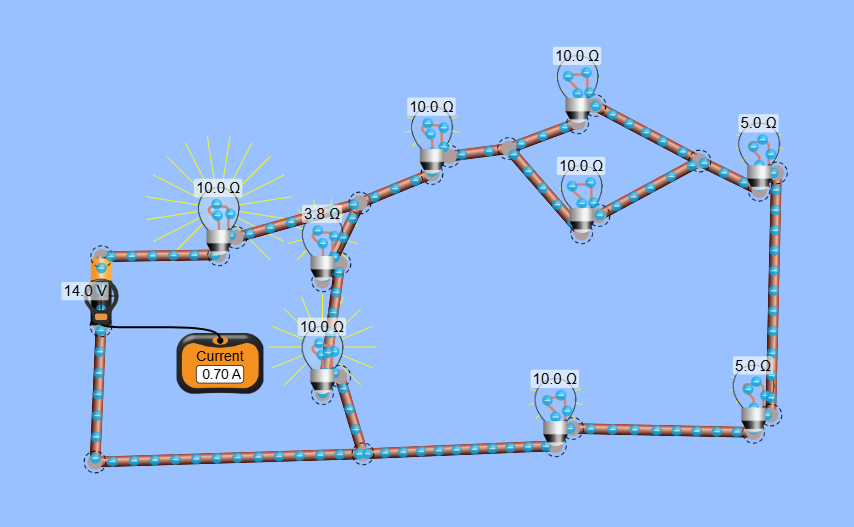 Ampere = Volt/Rtotal(Ω)= 14 ÷ 19,897540983606557= 0,7036045314109165 = 0,7 Ampere